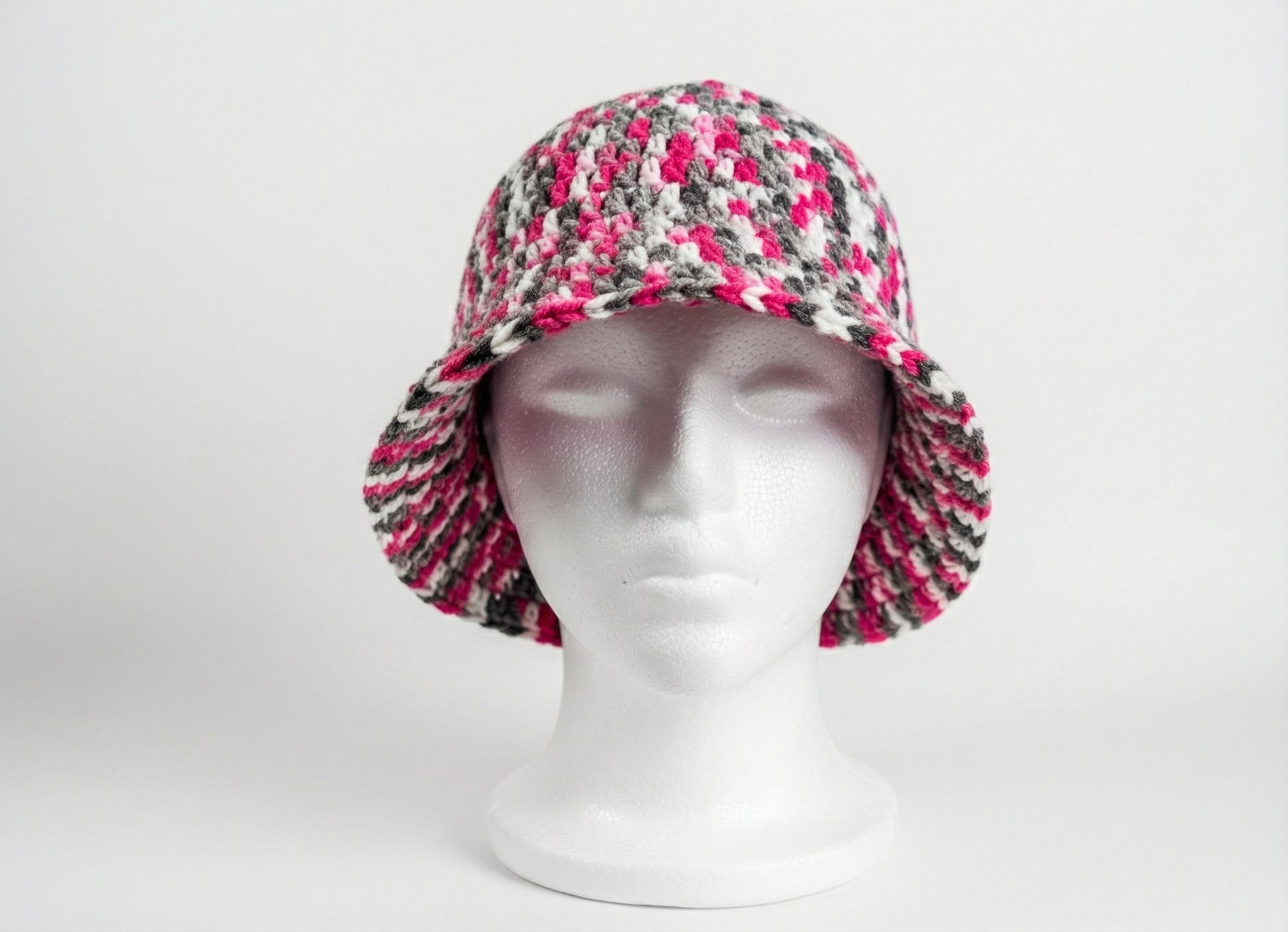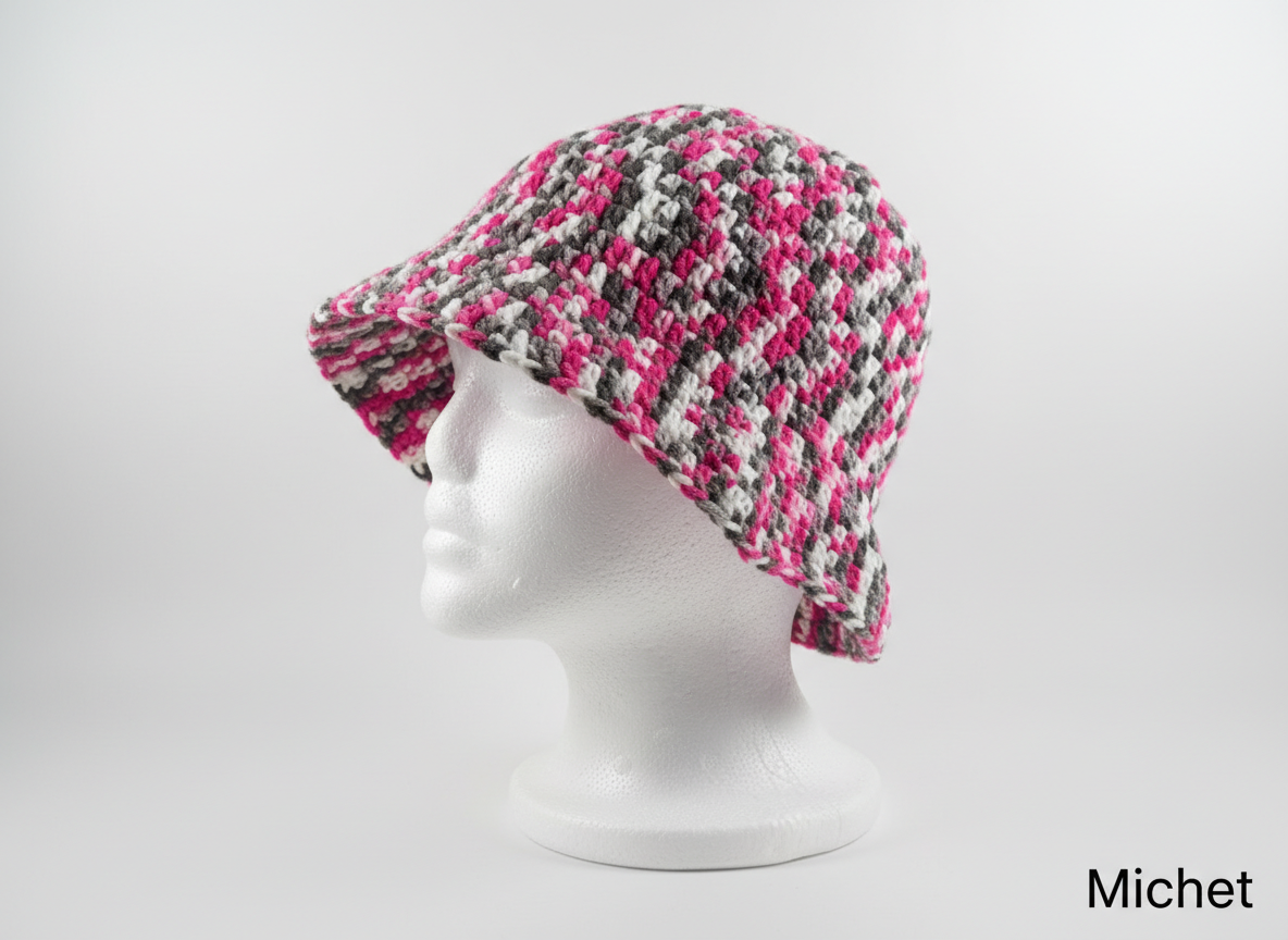 A statement crochet bucket hat designed to elevate your everyday look, handmade with care from soft breathable acrylic yarn, lightweight but structured.